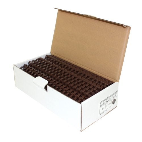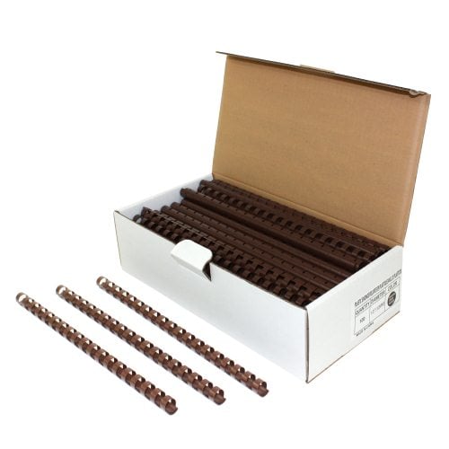 These brown 1/2" plastic combs are some of the highest quality binding combs on the market and are designed to fit any standard plastic comb binding machine . Hand-rolled to provide a smooth glossy finish, these 1/2" brown combs allow pages to flip freely and lie flat for easy reading and margin to margin photocopying. Designed for use with 8.5" x 11" pages, these 1/2" spines can hold about 85 sheets. Each 19-ring brown 1/2" plastic binding comb is made of rigid PVC plastic that won't scratch, chip, peel, or discolor. Get 100 brown 1/2" plastic combs with every order. Product number PC120BN.
