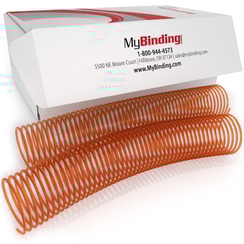 This 50mm Tangerine spiral binding coil is designed for use in any 4:1 pitch spiral coil binding machine. Made from the highest quality food grade PVC plastic our ColorCoil offers a quality, professional look while binding documents up to 2" thick. Although these particular coils are Tangerine we carry 4:1 pitch coil in 45 different colors and in sizes up to 50mm in diameter. These 50mm coils are designed to bind documents that are up to 46mm (1 13/16") including covers. Plus, all of our Tangerine binding coils are CPSIA and ROHS compliant and are made in either Canada or the USA (not China).