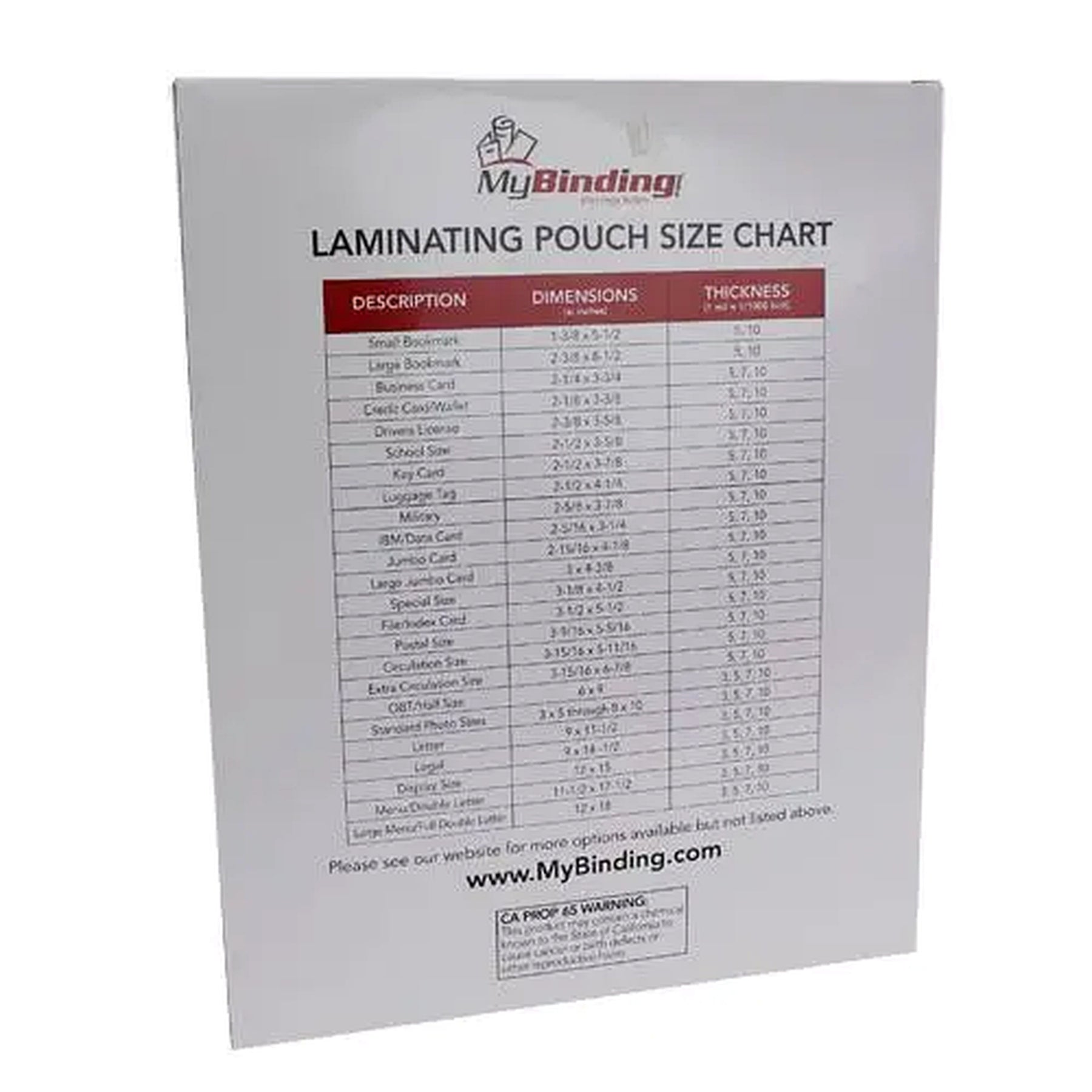 Our high quality laminating pouches help to improve the value of all printed materials. They enhance colors by turning dull prints into bright lustrous colors, help to prolong the life of printed materials and preserves them and protect them from outside elements. All of our pouches include one carrier per box. These pouches have superb clarity and offer exceptional value for reasonable prices. High Quality Laminating Pouches — Our laminating pouches are some of the best on the market. They deliver the same quality thickness you would get if you were using a professional lamination roll. Each pouch is made out of two sheets of laminate, pre-sealed on one end. That means our 5 mil pouches, include a sheet of that thickness on either side, resulting in a total pouch thickness of double that. Some manufacturers advertise 5 mil but only deliver 2.5 mil per sheet resulting in a lower quality lamination than if you had used 5 mil roll lamination. It is important to us that our pouches utilize the full thickness that professionals and hobbyists alike expect and rely on for durability and clarity. Adhesive to Laminate Construction — Our laminating pouches are made with a precise combination of premium laminate and adhesive. Below is the breakdown of the laminate-to-adhesive ratios for each side of our laminating pouches. 10 mil pouch: 6 mil laminate + 4 mil adhesive per side 7 mil pouch: 4 mil laminate + 3 mil adhesive per side 5 mil pouch: 3 mil laminate + 2 mil adhesive per side 3 mil pouch: 1.5 mil laminate + 1.5 mil adhesive per side
