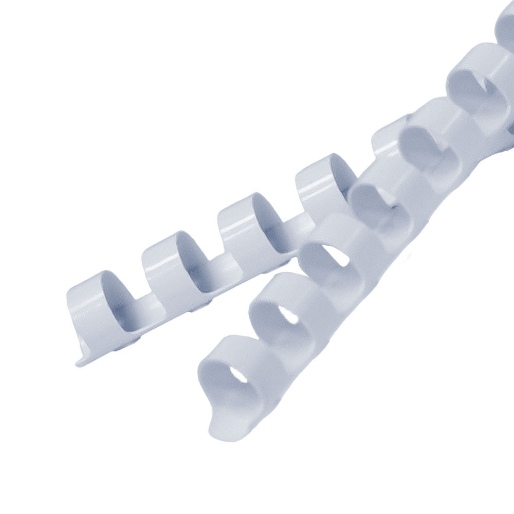These white 9/16" plastic combs are some of the highest quality binding combs on the market and are designed to fit any standard plastic comb binding machine . Hand-rolled to provide a smooth glossy finish, these 9/16" white combs allow pages to flip freely and lie flat for easy reading and margin to margin photocopying. Designed for use with 8.5" x 11" pages, these 9/16" spines can hold about 105 sheets. Each 19-ring white 9/16" plastic binding comb is made of rigid PVC plastic that won't scratch, chip, peel, or discolor. Get 100 white 9/16" plastic combs with every order. Product number PC916WH.
