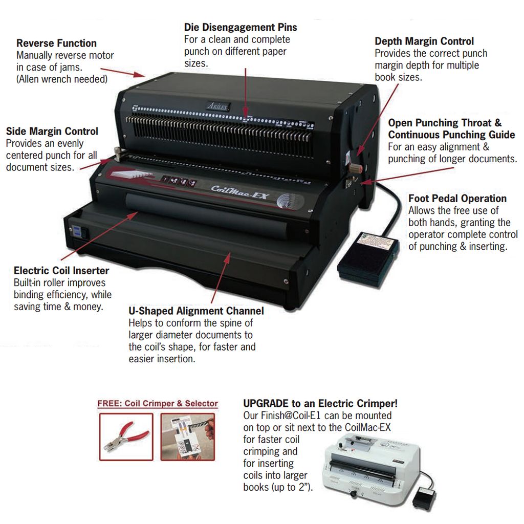 This Akiles CoilMac-EX Plus 4:1 Oval Hole Electric Coil Binding Machine is an all-in-one electric coil punch, electric inserter. With its heavy-duty punch motor, built-in electric coil inserter and complete system of functions, this Akiles CoilMac-EX Plus makes coil binding fast, easy, convenient and professional. This heavy duty all-metal constructed Akiles CoilMac-EX Plus can punch upto 25 sheets of 20lb paper , has fully disengageable punch pins, and has a 13.5" punch throat with open ends for longer documents and continuous punch guide. This Akiles CoilMac-EX Plus 4:1 Oval Hole Electric Coil Binding Machine is backed by a 1-Year Manufacturer's Warranty.