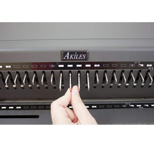 This Akiles CombMac-EX Electric Comb Binding Machine is a heavy duty electric comb punch and manual comb opener. With its heavy-duty punch motor, built-in comb opener and complete system of functions, this Akiles CombMac-EX makes comb binding fast, easy, convenient and professional. This heavy duty all-metal constructed Akiles CombMac-EX can punch upto 25 sheets of 20lb paper , has fully disengageable punch pins, and has a 14" punch throat with open ends for longer documents and continuous punch guide. This Akiles CombMac-EX Electric Comb Binding Machine is backed by a 1-Year Manufacturer's Manufacturer's Warranty.