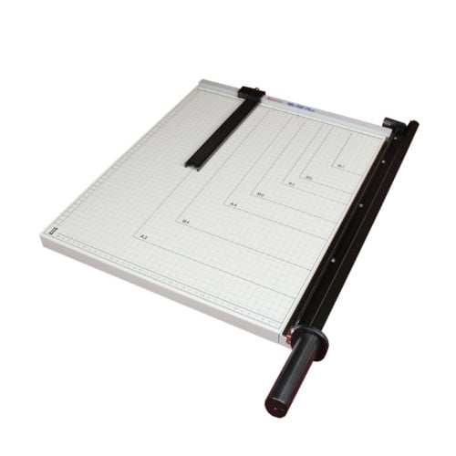 The OffiTrim Plus manual paper cutter is an economical way of cutting small to moderate amounts of paper at one time. The clamping system and back gauge are both manually adjustable for precise cuts. The OffiTrim manual paper cutter requires you to physically lift and press down on the lever in order to cut paper. This manual paper cutter works on a spring mechanism, thus reducing the amount of actual force you need to apply to cut the paper. OffiTrim Plus features an extremely durable metal table with simple and easy to ready ruler guide layout. The Akiles Offitrim 1512 Paper Cutter includes a magnetic paper stopper to aid in cutting evenly sized sheets every time. The Offitrim 1512 also has a 15" stainless steel hardened blade with a convex edge for a more efficient cut and a refined anti-rust treatment. The Offitrim 1512 includes a spring loaded blade that automatically returns to the open position after each cut and has a safety control to keep the knife closed when the cutter is not in use. Innovative swivel lock design created to help create a safer environment by preventing the blade from opening by accident. Additionally, the Offitrim 1512 has a pressure bar to hold the paper firmly in place when cutting and includes a convenient ruler-guide system for easier and straighter alignment cutting.
