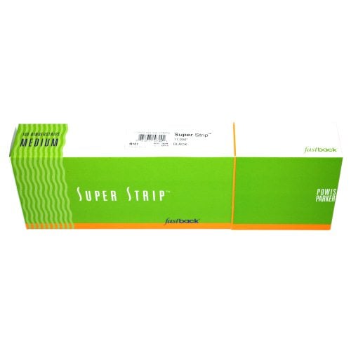 These black 11" medium Powis Parker Fastback Super Strips bind books and documents with speed, strength, and versatility. These strips are compatible with the Fastback 20, and the Fastback 15xs. These black 11" strips are the ideal choice for foil printing spine titles with the PowisPrinter or for making hard cover books. Measuring 11" in length, the medium Super Strips have a capacity of 1/2"-1" or 126-250 pages. Fastback Super Strips are also available in wide and narrow lengths as well as an assortment of different colors. These black 11" medium Super Strips are designated with the product number M101. Get 100 strips with every order.