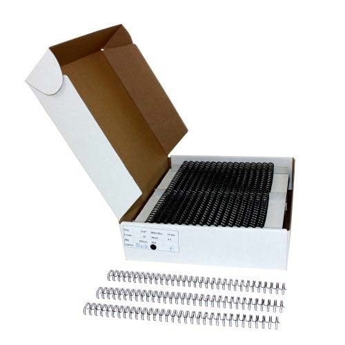 These high quality Black 3/8" 3:1 Pitch Twin Loop Wires are some of the best wire binding spines on the market today. Also called Wire-O, WireBind, and Double Loop Wire, these black 3/8" 3:1 pitch elements let pages lie flat with 360 Degrees rotation for convenient note-taking and photocopying as well as provide a permanent bind to your documents--meaning your pages stay secure and protected. Not only that, but these black 3/8" 3:1 pitch wire spines look a tad more refined than a plastic comb or spiral coil. Measuring 3/8" in diameter, these black twin loop wires can hold approximately 50-60 sheets. These black 3/8" 3:1 pitch twin loop wires come open in a "C" shape, allowing you to insert the spines into your punched pages and then simply use your wire binding machine or wire closer to finish your books. Product number W380BK.