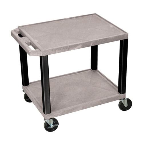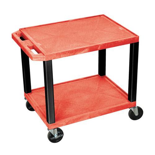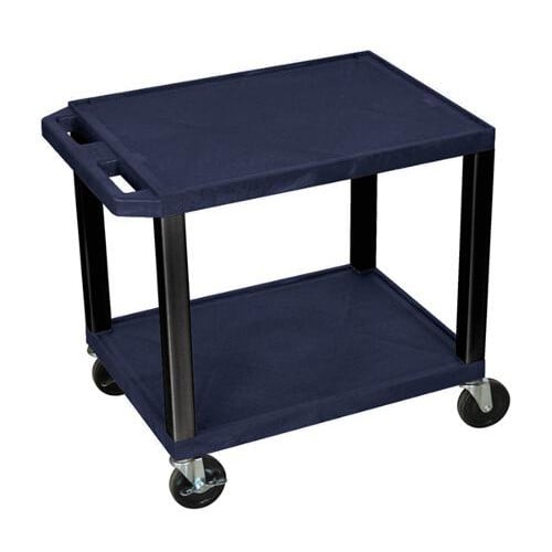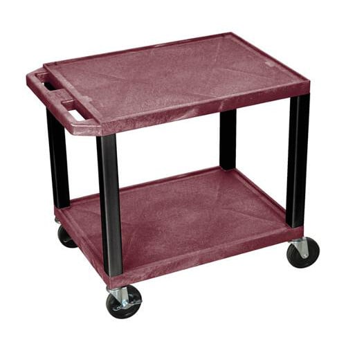 This H. Wilson 24.5" High Tuffy Utility A/V Cart (2-Shelf Black Legs) are made of recycled molded plastic shelves that will not chip, warp, scratch, rust or peel. Measures 18"L x 24"W x 24 1/2"H. Two 1.5"-thick flat shelves with raised texture surface to ensure minimal sliding and .25" retaining lip borders flat shelves. Legs measure 1.5" square. Ergonomic push handle molded into top shelf for easy maneuverability. Rolling cart with four 4" silent roll, full swivel heavy duty casters, two with locking brake. Three-outlet recessed electrical assembly with 15' cord, built-in cord wrap and three cable management clips. Assembly required. The H. Wilson 24.5" High Tuffy Utility A/V Cart (2-Shelf Black Legs) are Made in the USA and has a Lifetime Warranty.