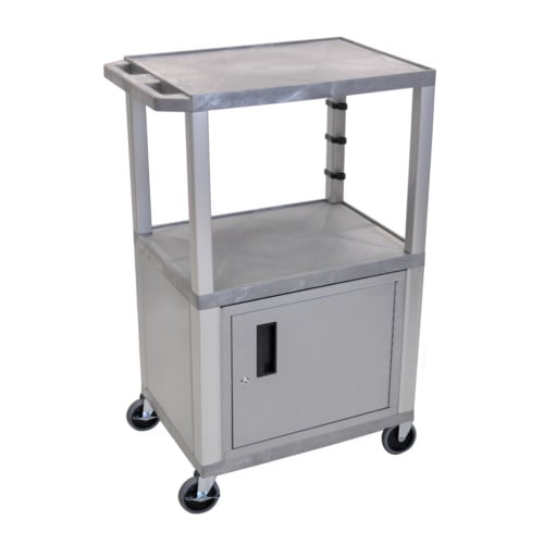 This H. Wilson Tuffy 42" Utility and Audio / Visual Cart with Cabinet (3-Shelf Nickel Legs) is made of recycled molded plastic shelves that will not scratch, dent, rust or stain. Measures 24"W x 18"D x 42.5"H. Three 1.5"-thick flat shelves with raised texture surface to ensure minimal sliding and .25" retaining lip borders flat shelves. Includes locking cabinet made from 20-gauge steel with powder coat paint finish, full piano door hinges, recessed handle, and set of two keys. Legs measure 1.5" square. Ergonomic push handle molded into top shelf for easy maneuverability. Rolling cart with four 4" full swivel heavy duty casters, two with locking brake. Three-outlet recessed electrical assembly with 15' cord, built-in cord wrap and three cable management clips. Assembly required. The H. Wilson Tuffy 42" Utility and Audio / Visual Cart with Cabinet (3-Shelf Nickel Legs) is Made in the USA and has a Lifetime Warranty.