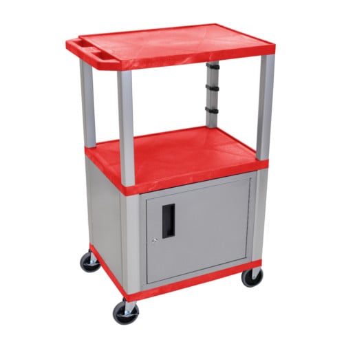 This H. Wilson Tuffy WT42RC4E-N Red 18" x 24" Utility and Audio / Visual Cart with Cabinet (3-Shelf Nickel Legs) is made of recycled molded plastic shelves that will not scratch, dent, rust or stain. Measures 24"W x 18"D x 42.5"H. Three 1.5"-thick flat shelves with raised texture surface to ensure minimal sliding and .25" retaining lip borders flat shelves. Includes locking cabinet made from 20-gauge steel with powder coat paint finish, full piano door hinges, recessed handle, and set of two keys. Legs measure 1.5" square. Ergonomic push handle molded into top shelf for easy maneuverability. Rolling cart with four 4" full swivel heavy duty casters, two with locking brake. Three-outlet recessed electrical assembly with 15' cord, built-in cord wrap and three cable management clips. Assembly required. The H. Wilson Tuffy WT42RC4E-N Red 18" x 24" Utility and Audio / Visual Cart with Cabinet (3-Shelf Nickel Legs) is Made in the USA and has a Lifetime Warranty.